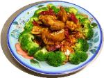 Sliced Steak in a hot orange sauce with broccoli.